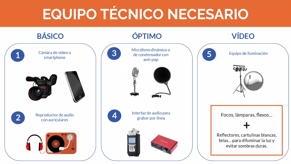 Lo mínimo es disponer de una cámara (si no, podemos usar un smartphone) y un reproductor de música con unos auriculares para escuchar la pista de referencia mientras grabamos. También un trípode, un micrófono y focos o lámparas para iluminar en el caso de que no se use la luz natura.