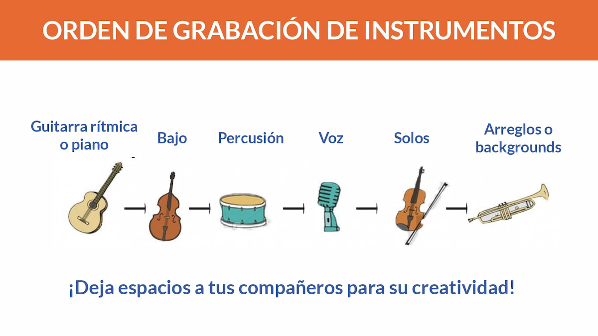 - En primer lugar grabará la sección rítmica, comenzando por guitarra o teclado, dónde quedará clara la estructura, la armonía, el tempo y la acentuación del tema.