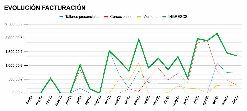 Pero lo más importante es que la parte que proviene de la venta de cursos (línea roja en el gráfico) ha crecido muchísimo al igual que el servicio de mentoría. Ya que estas dos fuentes de ingresos son que me permiten deslocalizar el trabajo y hacerlo en remoto y hacerlo compatible con mi actividad artística con mi banda Gata Brass Band (conciertos y ensayos).